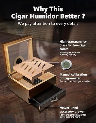EASY TO STORE ACCESSORIES – Anyone who likes cigars may be confused about the volume of accessories you need. This humidor is designed with a sliding-out storage drawer, so you can store all the accessories, such as lighters, cigar cutters and even travel humidors. And the drawer adds a hidden handle, which is easier to pull out